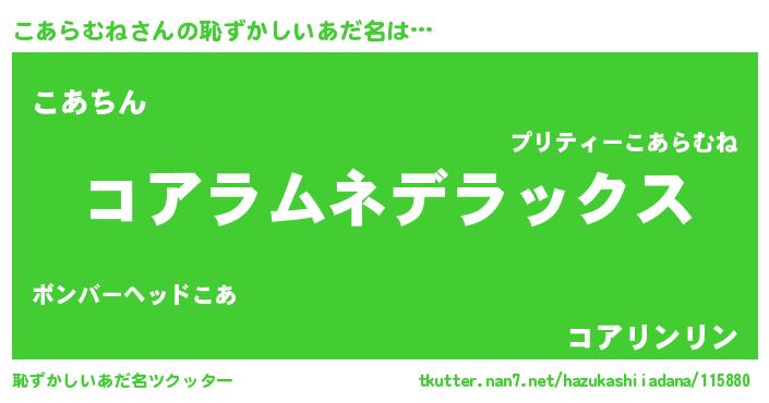| ヘコむあだ名 | 『こあらむね(笑)』『こあお』『牛乳』 |