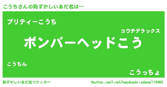 こうちさんの恥ずかしいあだ名は… 『ボンバーヘッドこう』『プリティーこうち』『こうっちょ』 ツクッター #恥ずかしいあだ名ツクッター http://tkutter.nan7.net/hazukashiiadana/116068/