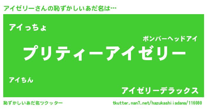 | 男性向けラノベタイトル風あだ名 | 『アイゼリー~年齢イコール彼女いない歴の魔法使い~』 |