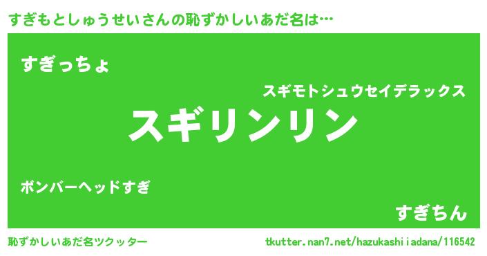 | 男性向けラノベタイトル風あだ名 | 『すぎもとしゅうせいに滅ぼされるだけの簡単なお仕事です』 |