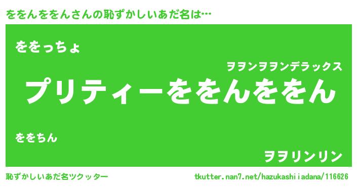 ををんををんさんの恥ずかしいあだ名は… 『プリティーををんををん』『ををっちょ』『ヲヲリンリン』 ツクッター #恥ずかしいあだ名ツクッター http://tkutter.nan7.net/hazukashiiadana/116626/