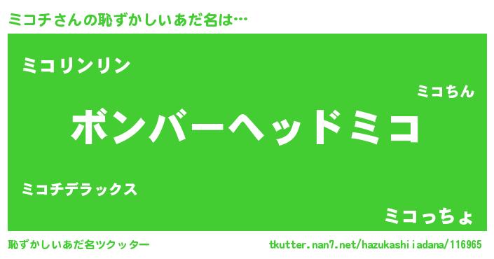 | ヘコむあだ名 | 『ミコ太郎』『豆乳』『ミコにゅー』 |
