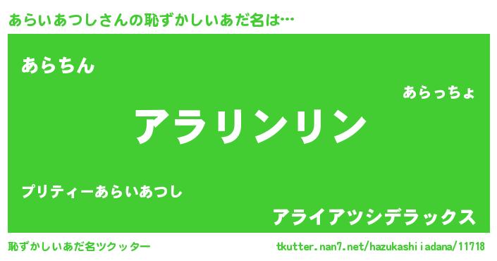 | 男性向けラノベタイトル風あだ名 | 『あらいあつしの嫁は女の子じゃないと思った?』 |