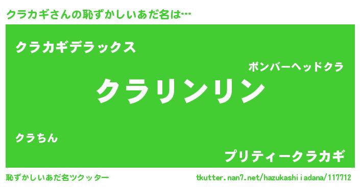 クラカギさんの恥ずかしいあだ名は… 『クラリンリン』『クラカギデラックス』『プリティークラカギ』 ツクッター #恥ずかしいあだ名ツクッター http://tkutter.nan7.net/hazukashiiadana/117712/