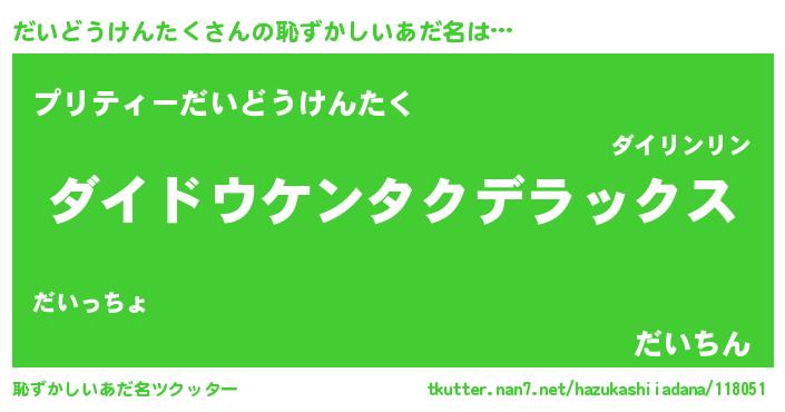 | 女子向けラノベタイトル風あだ名 | 『だいどうけんたくなんてお断りですっ。』 |