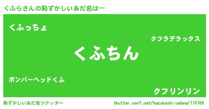 | 女子向けラノベタイトル風あだ名 | 『くふらの契約王妃』『くふら様がみてる』 |