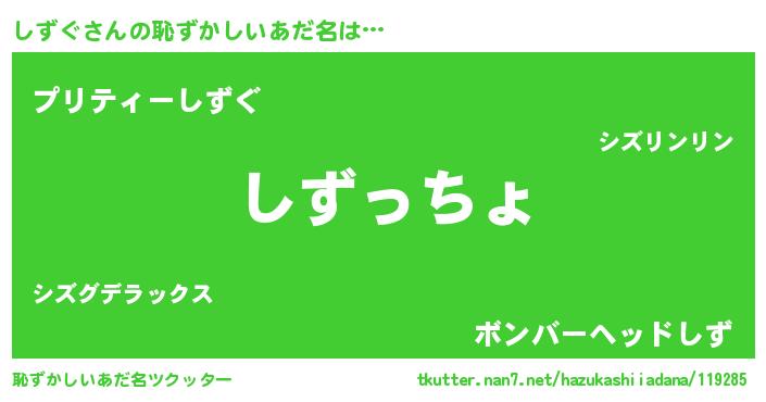 | 男性向けラノベタイトル風あだ名 | 『シズグスレイヤー』『魔弾の王としずぐ』 |