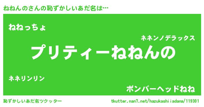 | 男性向けラノベタイトル風あだ名 | 『ねねんのの憂鬱』『ネネンノスレイヤー』 |