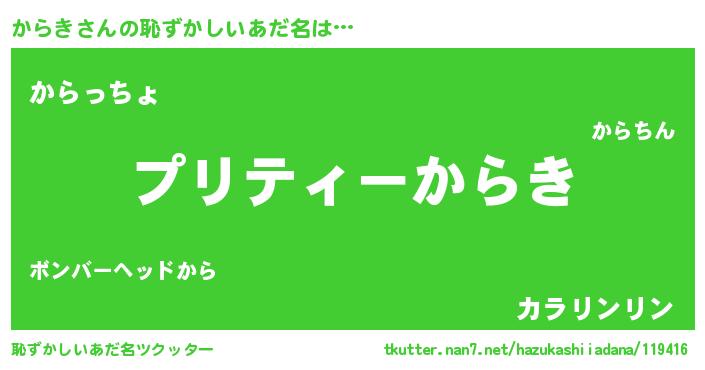 | 男性向けラノベタイトル風あだ名 | 『からきの憂鬱』『魔弾の王とからき』 |