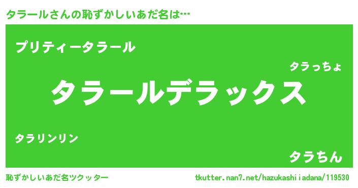 | 女子向けラノベタイトル風あだ名 | 『タラールなんてお断りですっ。』 |