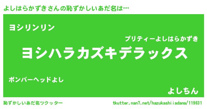 | 男性向けラノベタイトル風あだ名 | 『この素晴らしい世界によしはらかずきを!』 |