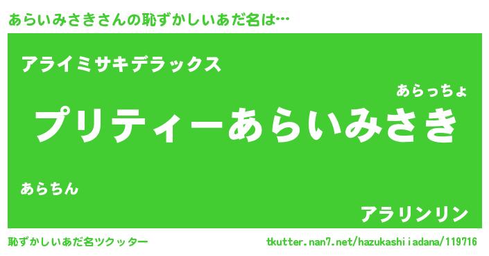 | 男性向けラノベタイトル風あだ名 | 『アライミサキアートオンライン』 |