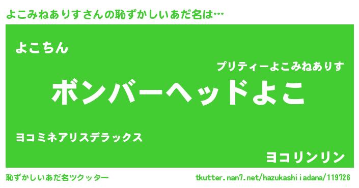| ヘコむあだ名 | 『よこみねありす(笑)』『よこを』 |