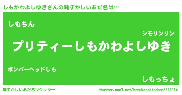 | ヘコむあだ名 | 『しもふぇ~』『しもかわよしゆき(笑)』 |