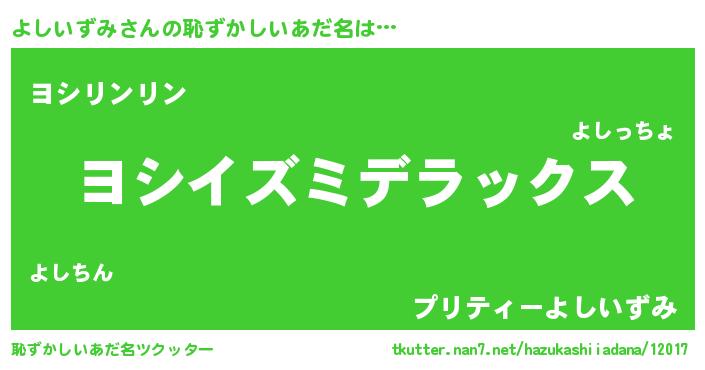 | 男性向けラノベタイトル風あだ名 | 『Re:よしいずみから始める異世界生活』 |