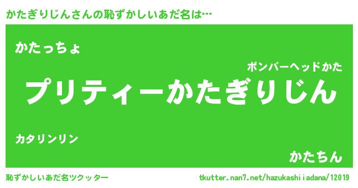 | 男性向けラノベタイトル風あだ名 | 『うちのかたぎりじんが世界を掌握している!』 |