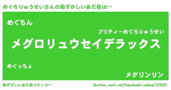 | ヘコむあだ名 | 『めぐろりゅうせい(震え声)』『めぐ太郎』 |