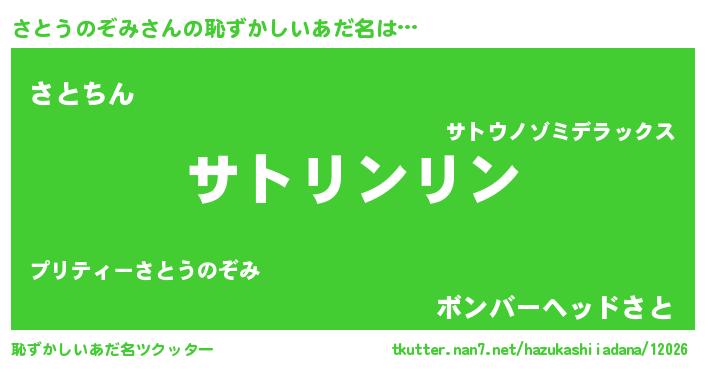 | 男性向けラノベタイトル風あだ名 | 『さとうのぞみの嫁は女の子じゃないと思った?』 |