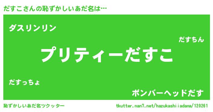 | 男性向けラノベタイトル風あだ名 | 『ダスコスレイヤー』『だすこの憂鬱』 |