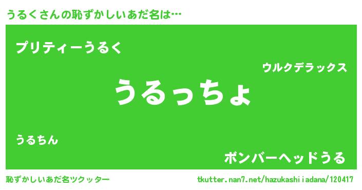 | 意味不明あだ名 | 『うるくフォーエバー』『ペロリンうるく』 |