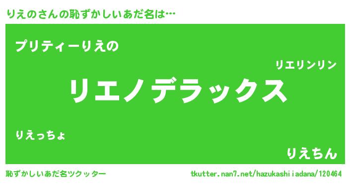 | 男性向けラノベタイトル風あだ名 | 『魔弾の王とりえの』『りえのの憂鬱』 |