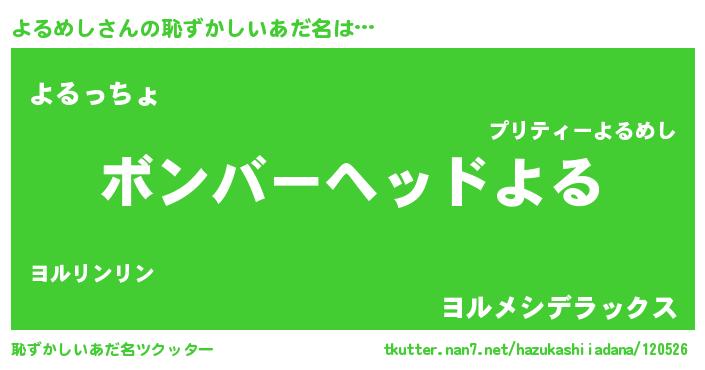 | ヘコむあだ名 | 『なまこ酢』『よるっふぃ~』 |