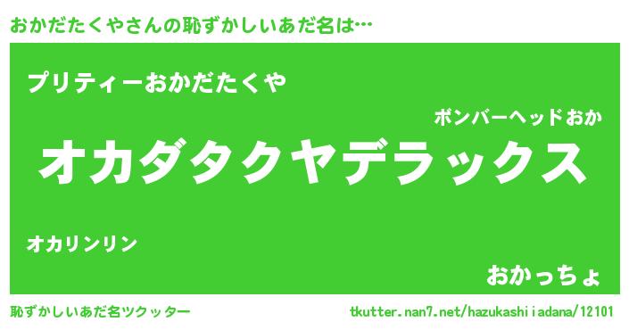 | 男性向けラノベタイトル風あだ名 | 『魔弾の王とおかだたくや』 |