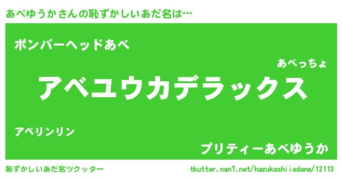 | 男性向けラノベタイトル風あだ名 | 『Re:あべゆうかから始める異世界生活』 |
