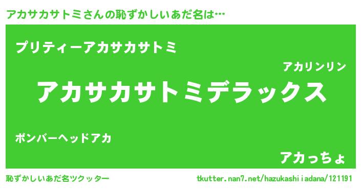 | 男性向けラノベタイトル風あだ名 | 『Re:アカサカサトミから始める異世界生活』 |
