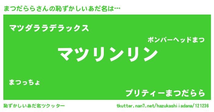 | 男性向けラノベタイトル風あだ名 | 『まつだららの嫁は女の子じゃないと思った?』 |