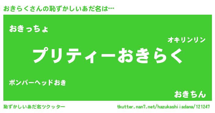 | 意味不明あだ名 | 『ペロリンおきらく』『永久保存おきらく』 |