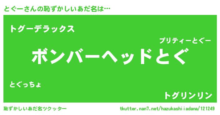 | 男性向けラノベタイトル風あだ名 | 『トグースレイヤー』『とぐーの憂鬱』 |