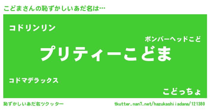 | 男性向けラノベタイトル風あだ名 | 『この素晴らしい世界にこどまを!』 |
