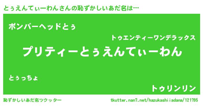 | 胡散臭い通販商品みたいなあだ名 | 『必ず成功するブレスレット…その名も「とぅえんてぃーわん」』 |