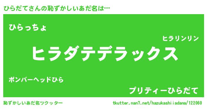 | 意味不明あだ名 | 『自称ひらだて』『ひらだてフォーエバー』 |