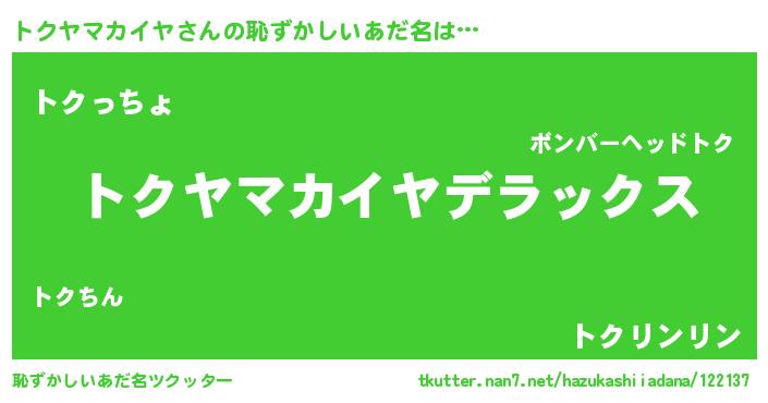 | 男性向けラノベタイトル風あだ名 | 『この素晴らしい世界にトクヤマカイヤを!』 |
