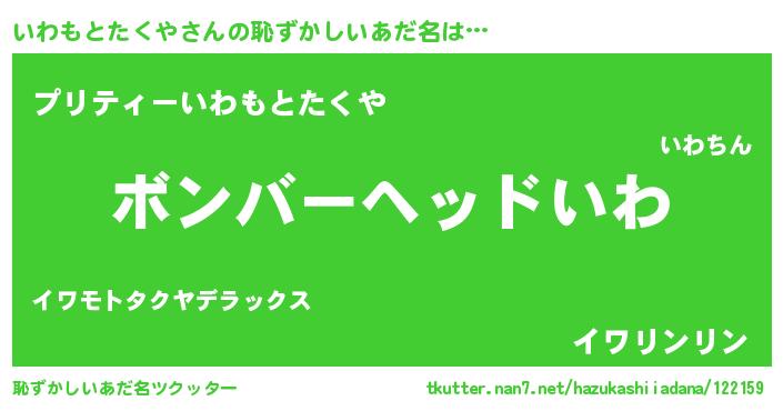 | 男性向けラノベタイトル風あだ名 | 『おまえをオタクにしてやるから、俺をいわもとたくやにしてくれ! 』 |