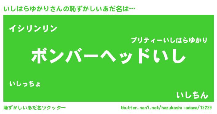 いしはらゆかりさんの恥ずかしいあだ名は… 『ボンバーヘッドいし』『イシリンリン』『いしちん』 ツクッター #恥ずかしいあだ名ツクッター http://tkutter.nan7.net/hazukashiiadana/12229/