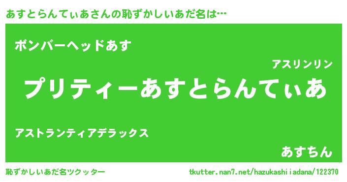 | 胡散臭い通販商品みたいなあだ名 | 『億万長者になれるブレスレット…その名も「あすとらんてぃあ」』 |