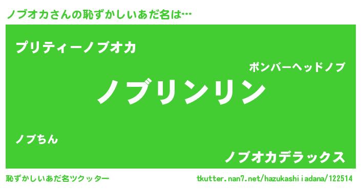 | 男性向けラノベタイトル風あだ名 | 『ダンジョンにノブオカを求めるのは間違っているだろうか』 |