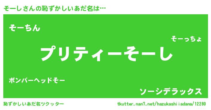 | 男性向けラノベタイトル風あだ名 | 『この素晴らしい世界にそーしを!』 |