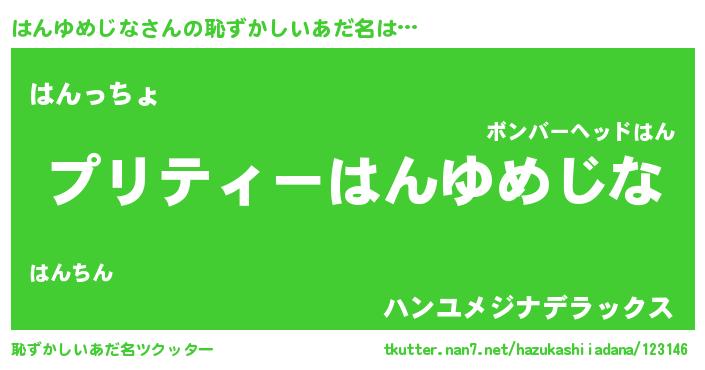はんゆめじなさんの恥ずかしいあだ名は… 『プリティーはんゆめじな』『はんっちょ』『ハンユメジナデラックス』 ツクッター #恥ずかしいあだ名ツクッター http://tkutter.nan7.net/hazukashiiadana/123146/