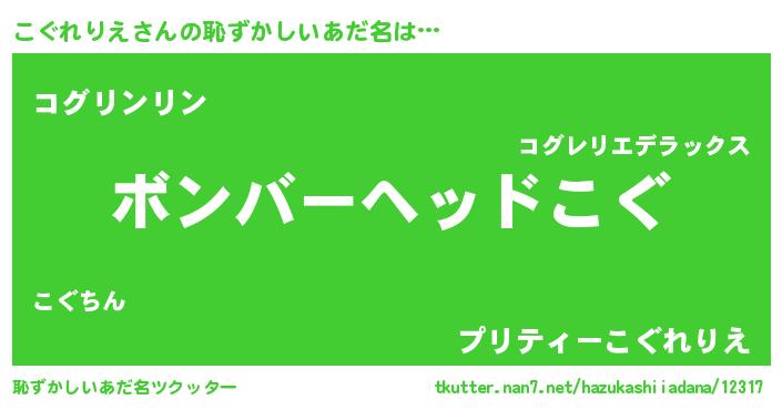 | ヒーロー風カッコイイあだ名 | 『慈愛の使者こぐれりえ』『炎刃騎士コグ』 |