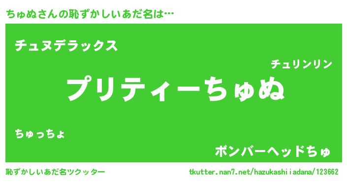 | 男性向けラノベタイトル風あだ名 | 『ちゅぬの憂鬱』『はたらくちゅぬさま!』 |