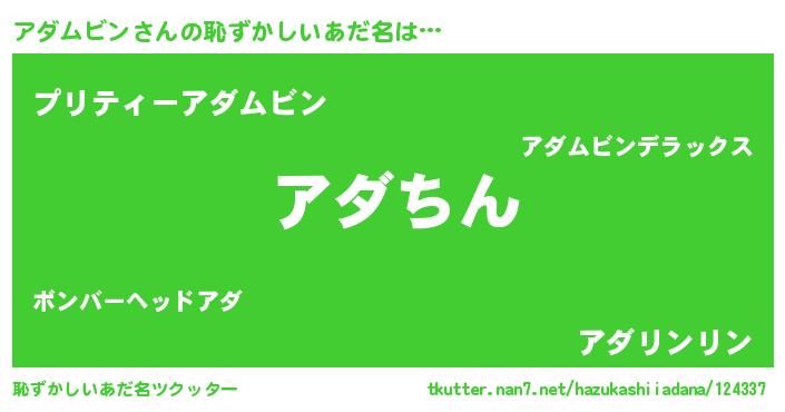 アダムビンさんの恥ずかしいあだ名は… 『アダちん』『プリティーアダムビン』『アダリンリン』 ツクッター #恥ずかしいあだ名ツクッター http://tkutter.nan7.net/hazukashiiadana/124337/