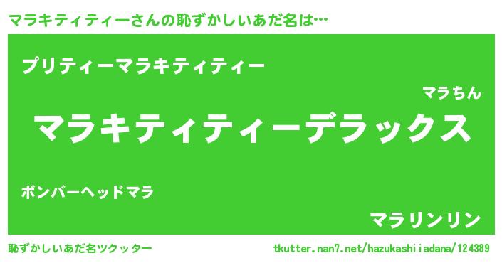 | 男性向けラノベタイトル風あだ名 | 『マラキティティー~年齢イコール彼女いない歴の魔法使い~』 |