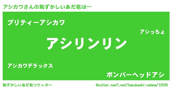 | 男性向けラノベタイトル風あだ名 | 『アシカワ~年齢イコール彼女いない歴の魔法使い~』 |