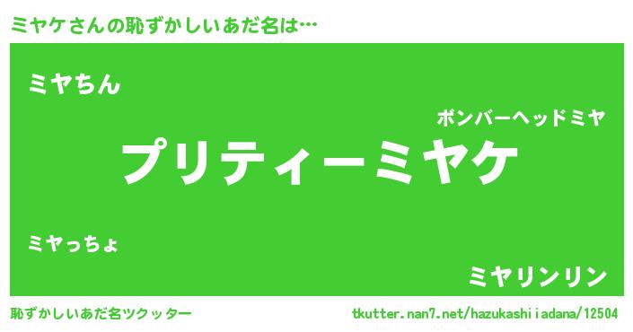 | ヘコむあだ名 | 『ミヤにゅー』『ミヤケ(笑)』 |