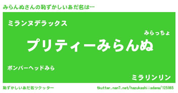 | 男性向けラノベタイトル風あだ名 | 『みらんぬ~年齢イコール彼女いない歴の魔法使い~』 |