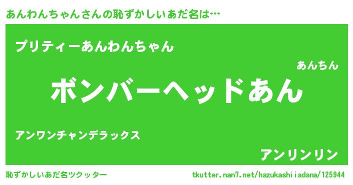 | 男性向けラノベタイトル風あだ名 | 『この素晴らしい世界にあんわんちゃんを!』 |